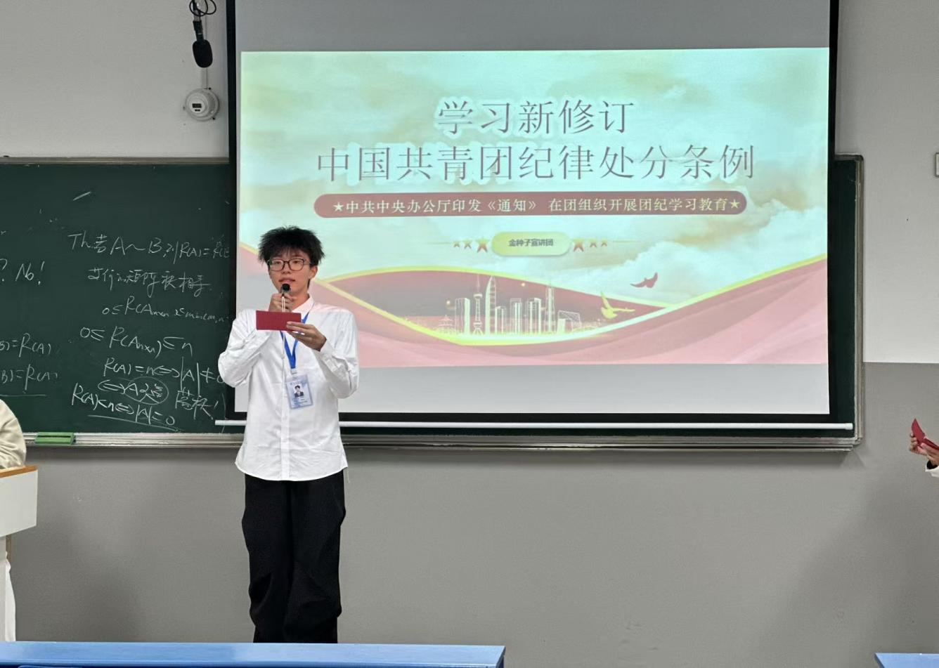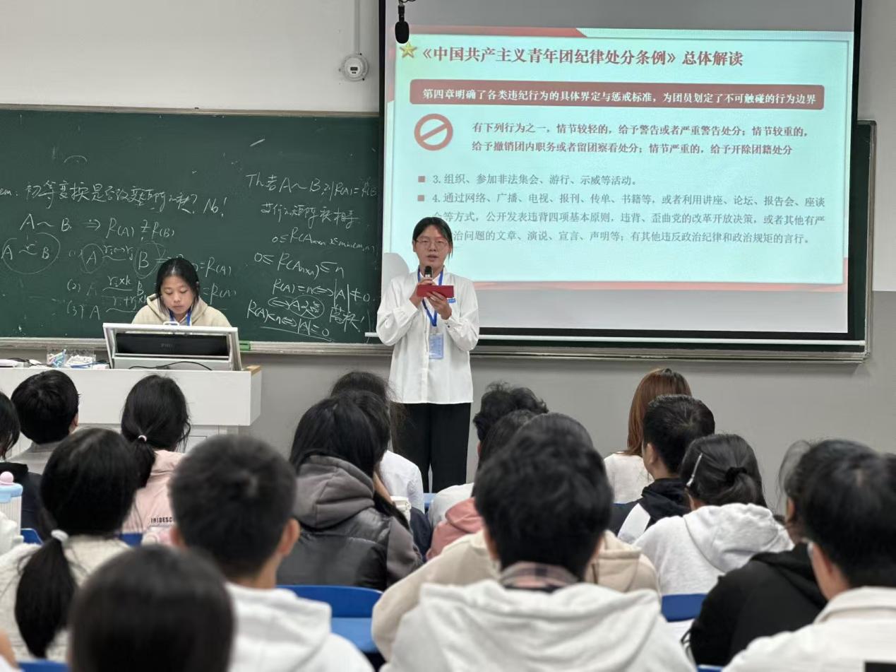 此次宣讲活动旨在抓住新生入学伊始的关键阶段,着力强化团员的组织观念和纪律规矩意识。宣讲团成员们围绕新修订的《中国共产主义青年团纪律处分条例(试行)》,从“为何要学纪守纪”切入,系统解读了《条例》的总则、违纪与处分种类、处分运用规则以及各类具体的违纪行为界定。主讲同学们结合政治纪律、组织纪律等“六大纪律”的核心要求,联系网络行为规范、宗教信仰政策等与青年学生密切相关的典型案例,为新生们划清行为的“红线”与“底线”,进一步强调了“学纪、知纪、明纪、守纪”的重要性。
