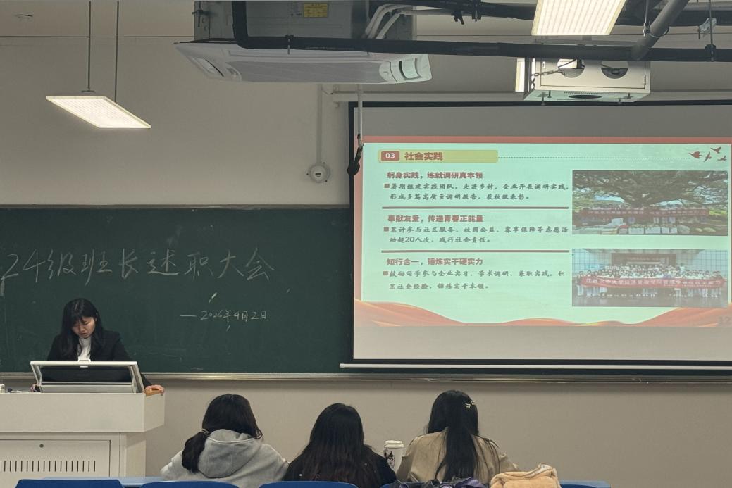 为强化班级骨干队伍建设,搭建班级工作交流平台,夯实学生管理工作基础,4月2日晚上,经济管理学院2025-2026学年班长述职大会在E教顺利举行,2023、2024、2025级班长同台述职,全面复盘工作、交流经验心得、共话班级成长。