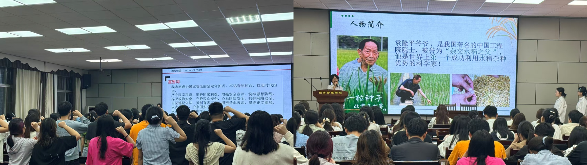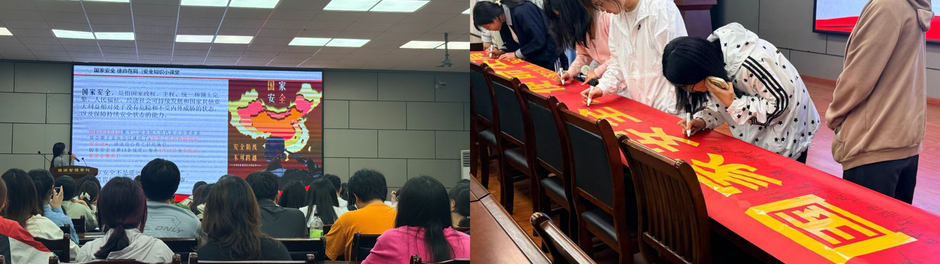 活动中,全体同学庄严宣誓,许下守护国家安全的青春承诺,让国家安全意识扎根心中、转化为行动自觉。“金种子”宣讲团以 “一粒种子守粮仓、一腔热血护家国” 为主线,讲述袁隆平、赵醒侬等榜样事迹,让同学们深刻理解国家安全多领域的重要意义。国家安全知识小课堂上,两位团支书围绕总体国家安全观,用通俗易懂的语言讲解政治、网络、经济、生态等 16 个重点领域安全知识,结合校园生活普及防范技能与法律常识。活动最后,全体同学依次在 “国家安全,使命在肩” 主题横幅上郑重签名,以笔墨许下守护国家安全的庄严承诺。