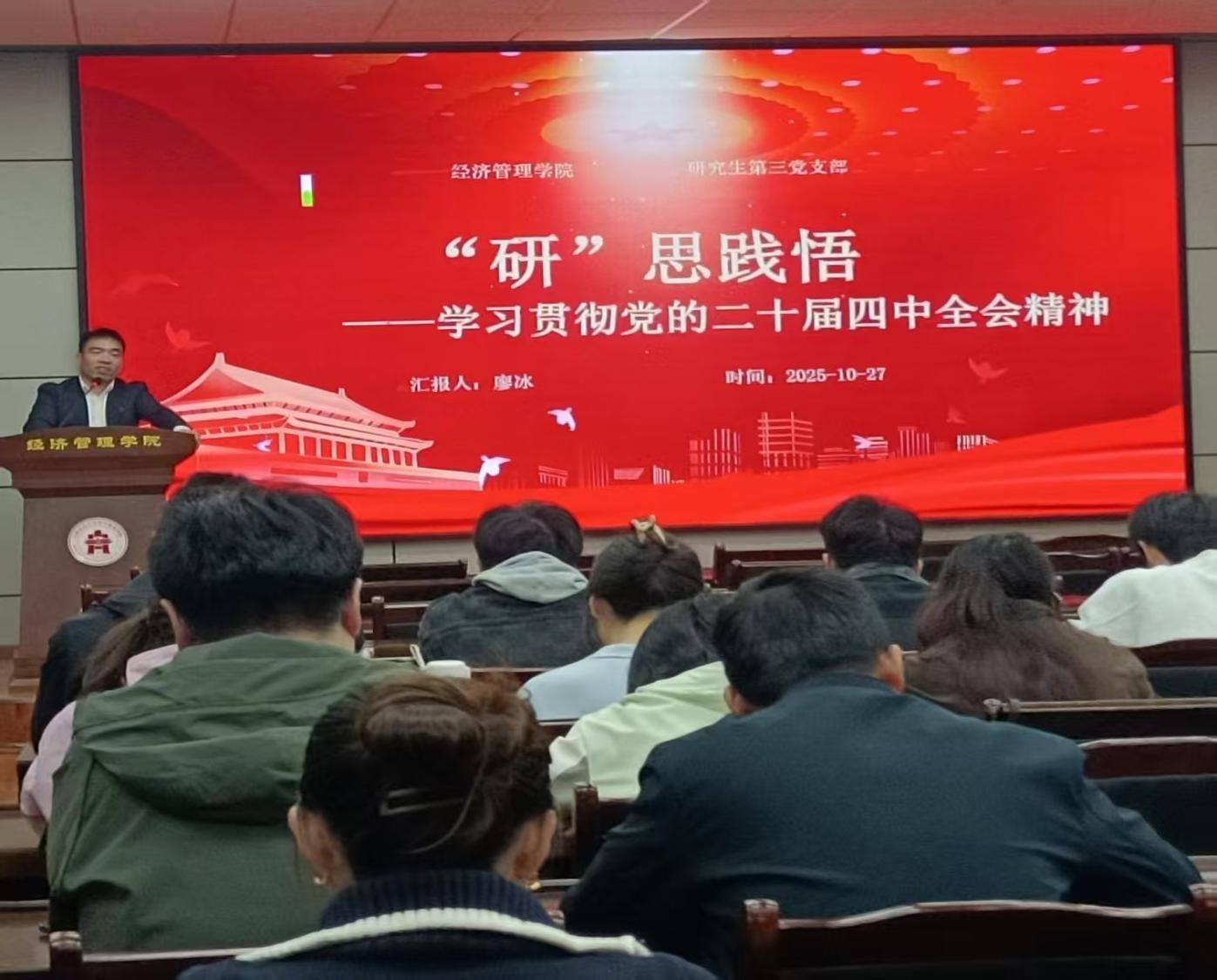 为深入学习领会党的二十届四中全会精神,引导党支部党员准确把握全会核心要义,统一思想、凝聚共识,10月27日晚,研究生第三党支部在经世楼召开“学习贯彻二十届四中全会精神”主题党日活动。党支部全体党员参与,活动由党支部书记廖冰同志主持。