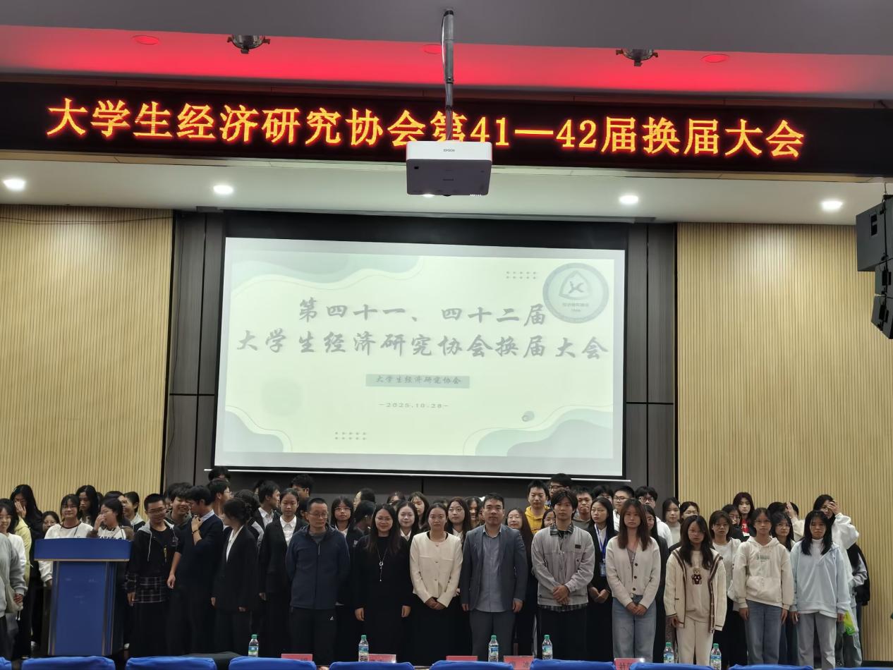 10月28日晚,大学生经济研究协会第42届换届大会在E-207教室圆满落幕。校团委刘艳婷老师,经管学院梁志民教授、艾娟博士,廖冰博士,校团委学生代表、各兄弟高校、兄弟社团学生代表应邀出席。经协全体新老会员近150人参加了此次换届大会。