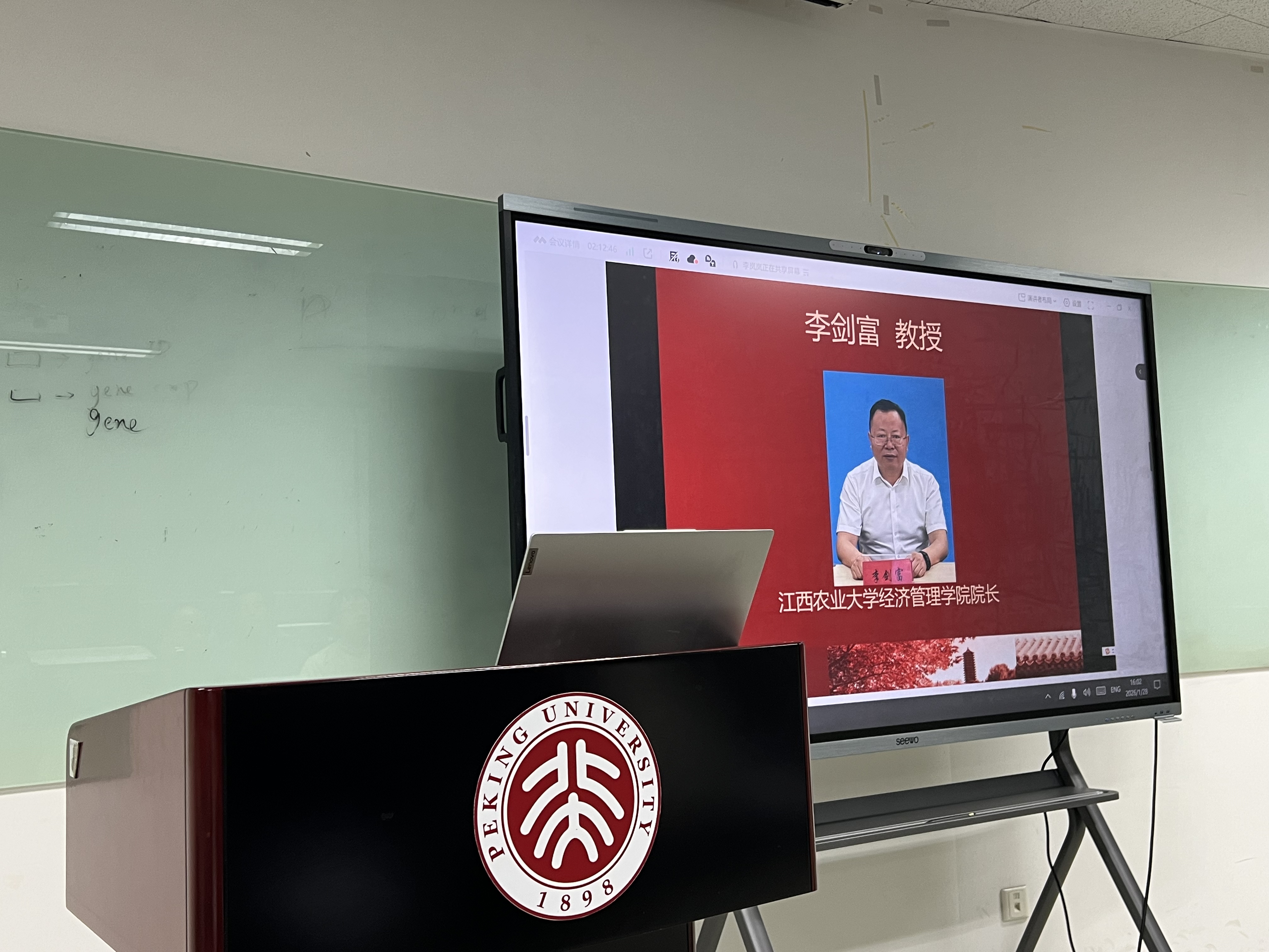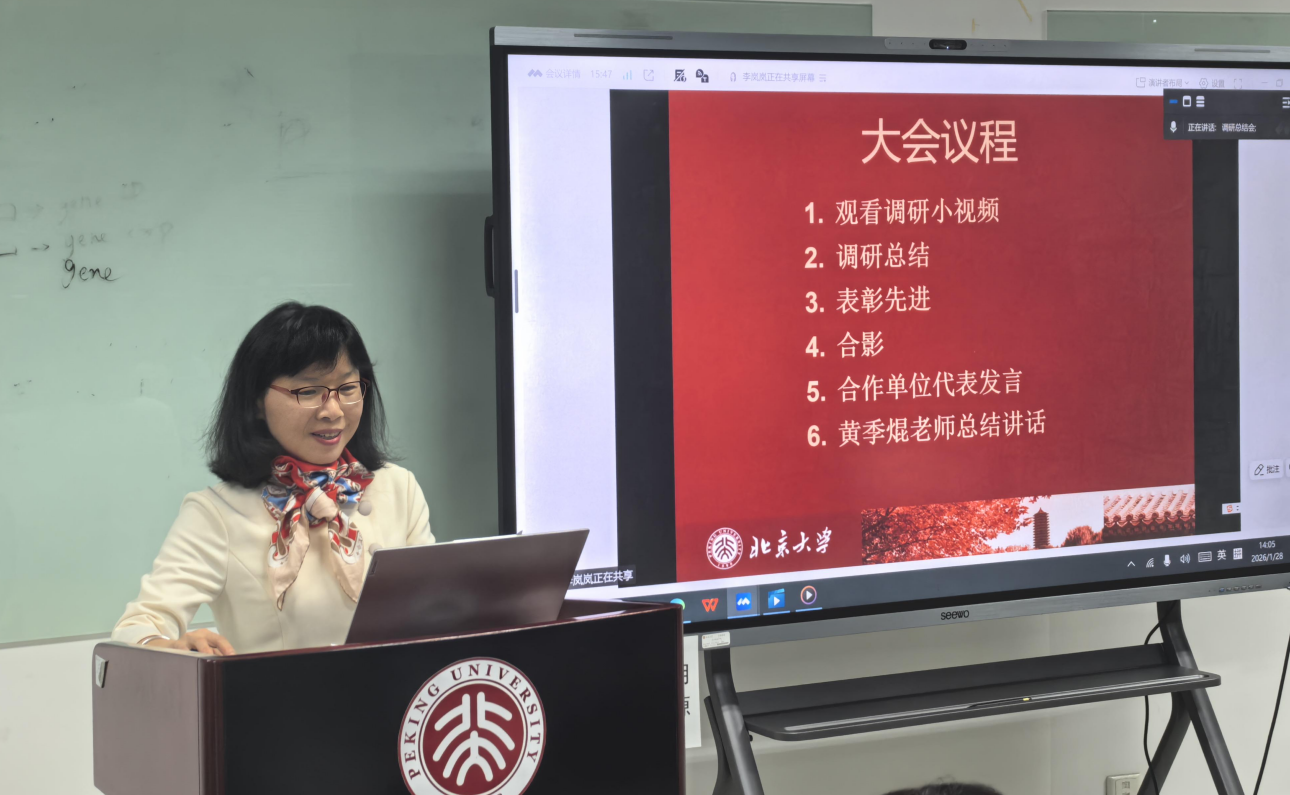 2026年1月28日下午,“中国乡村振兴战略智库数据库建设”项目总结暨表彰会在北京大学王克桢楼454会议室召开,北京大学现代农学院院长、江西农业大学经济管理学院名誉院长黄季焜教授、北京大学现代农学院副院长、中国农业政策研究中心副主任刘承芳教授等调研项目负责老师出席会议,100余位参加本次9省调研的教授、研究员、博士后以及优秀调研员代表通过线下或线上渠道参会,会议由刘承芳教授主持,项目总设计师黄季焜教授作总结讲话。江西农业大学经济管理学院师生线上参加会议,院长李剑富教授作为合作单位代表发言。